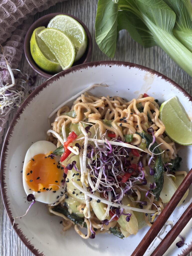 Pak Choi im Wok anbraten, dann Knoblauch, Ingwer und Chili hinzufügen. Mit Kokosmilch und Brühe ablöschen. Nudeln zugeben und mit Sesampaste, Erdnussbutter, Sojasauce und Limettensaft verrühren. Zum Schluss Lauchzwiebeln unterheben. Mit Sesam und Ei servieren – fertig ist ein cremiges, frisches Sommergericht, das einfach immer passt.